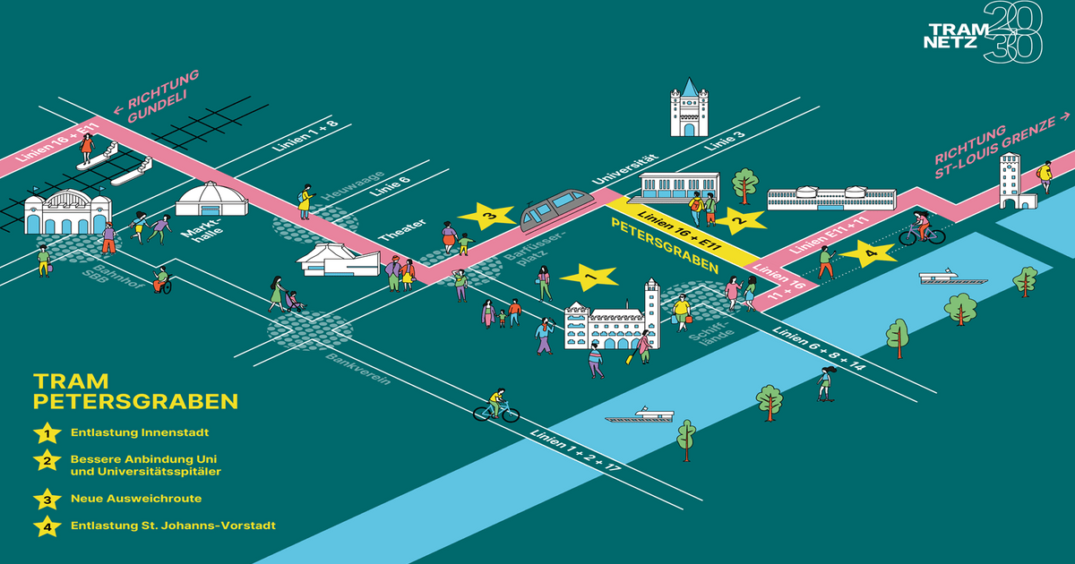 Dank der Tramverbindung durch den Petersgraben kann die Linie 16 zukünftig ab dem Barfüsserplatz via Petersgraben zur Schifflände fahren. Auch die Linie E11 wird zukünftig ab dem Barfüsserplatz über den Petersgraben bis zum Bahnhof St. Johann verkehren. Dadurch wird die Innenstadt vom Tramverkehr entlastet.