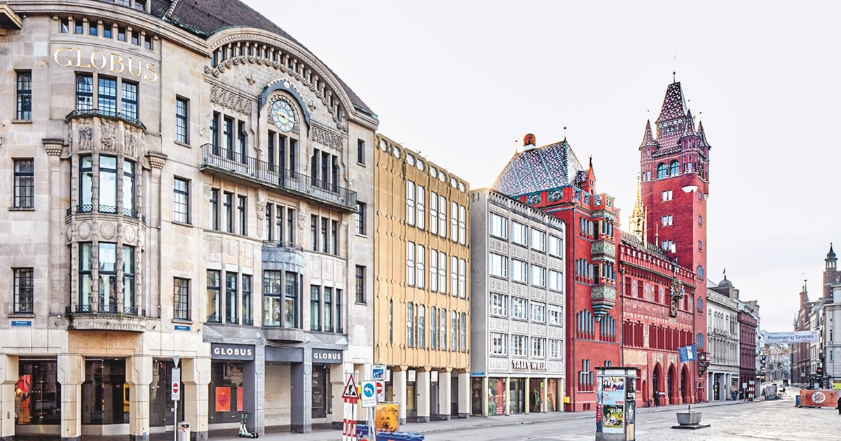 Am Marktplatz zum Beispiel wird die östliche Längsseite vom Rathaus mit seinem Turm und der roten Farbe dominiert. In sich ist es ein Komplex aus mehreren Bauzeiten: Während der Ursprungsbau von 1514 mit den drei offenen Arkaden am Anfang des 17. Jahrhunderts in fast identischer Formensprache erweitert wurde, sprengen die um 1900 errichteten Anbauten des Turms und der Neuen Kanzlei die Dimensionen, um dem Gebäude am damals vergrösserten Marktplatz eine stärkere Präsenz zu verleihen. Das Geschäftshaus zum Gold, 1952 nach Plänen von Hans Von der Mühll und Paul Oberrauch anstelle zweier schmaler Häuser errichtet, setzt sich mit der umgebenden Architektur auseinander. Vom Mittelbau des Rathauses wurde die Traufhöhe übernommen und die durchbrochene Attika entstand in Analogie zum Zinnenkranz des Rathauses. Mit dem hellgrauen Hartsandstein bildet das Haus zum Gold zusammen mit dem Gebäude der 1858 errichteten «Bank in Basel» (Marktplatz 11) eine farbliche Klammer um das Rathaus. Die von Heinrich Barz im Büro Suter & Suter entworfene gelbliche Fassade der Globus-Erweiterung von 1976 nimmt den geraden Fassadenabschluss und die Höhe vom Haus zum Gold auf und flankiert mit diesem zusammen den Einschnitt des Martinsgässleins. Die schmalen hochrechteckigen Fenster gleichen sich sowohl dem Fensterraster des Globus-Hauptgebäudes als auch dem des Rathauses an.