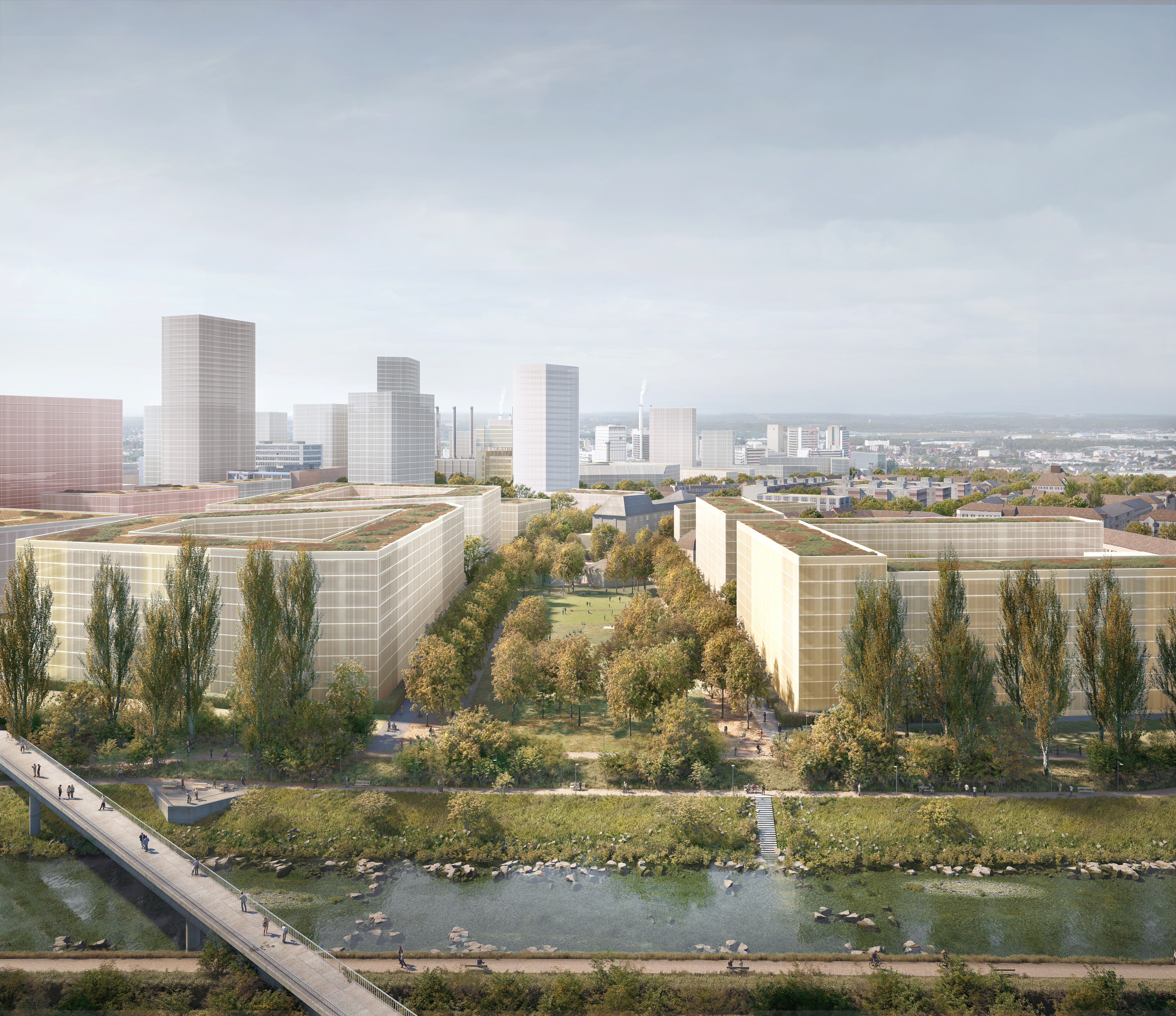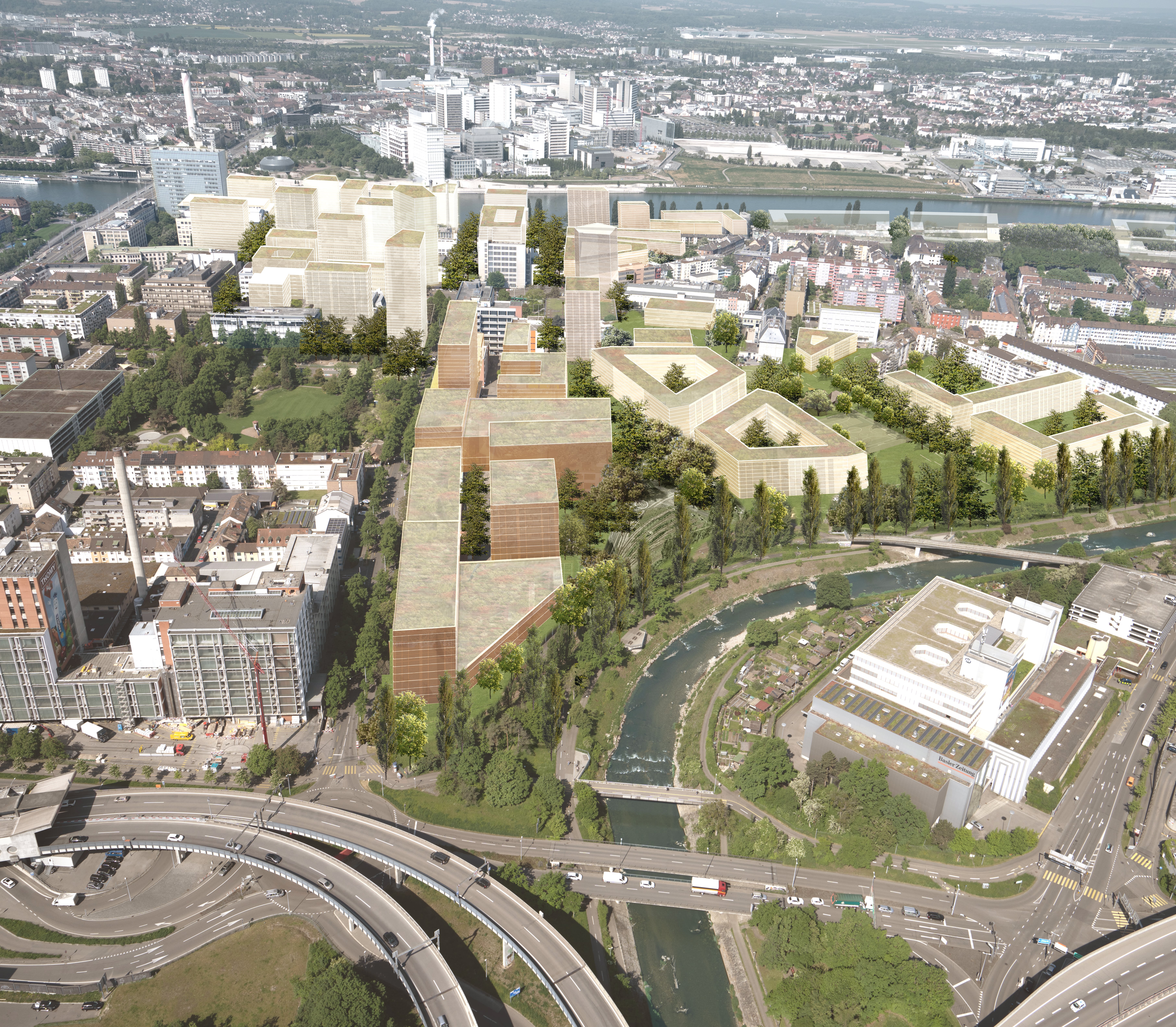 Das Klybeck-Areal soll zu einem offenen, grünen und durchmischten Stadtteil transformiert werden. Heute haben die Planungspartner Kanton Basel-Stadt, Swiss Life und Rhystadt das Richtprojekt klybeckplus vorgestellt. Neben Wohnraum für 8’500 Menschen – ein Drittel davon gemeinnützig in Kostenmiete – und 7’500 Arbeitsplätzen sind unter anderem zwei neue Parkanlagen, eine am Rhein und eine an der Wiese, geplant. Gemeinsam mit begrünten Vorgärten und zusätzlichen Bäumen sollen sie mehr Grün ins Quartier bringen. Das Richtprojekt bildet die Grundlage für die Nutzungsplanung.