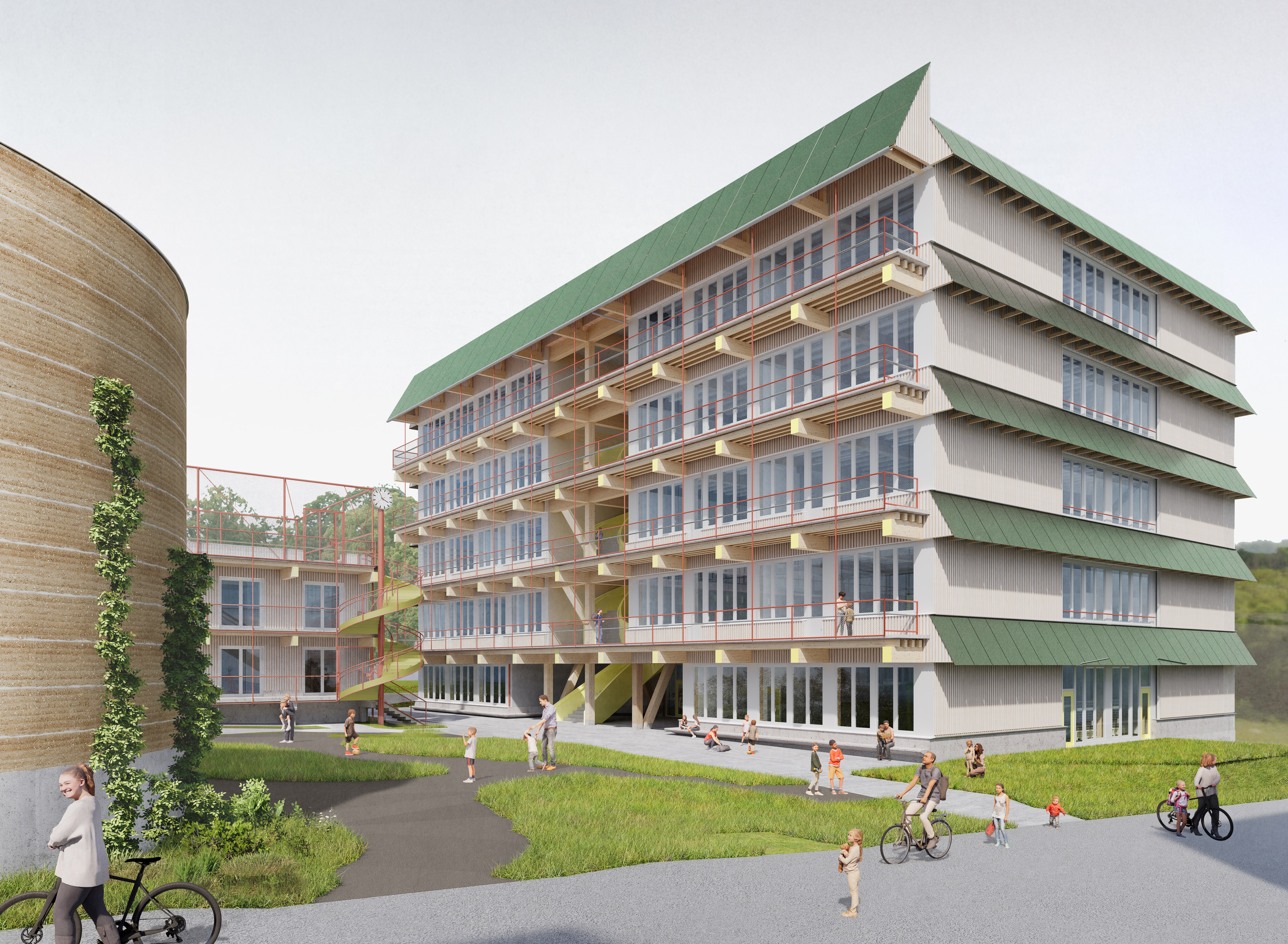 Für den Bau werden hauptsächlich nachwachsende Rohstoffe wie Holz und Lehm eingesetzt, um ein ökologisch verträgliches, recycelbares, ressourcenschonendes und emissionsarmes Gebäude zu schaffen. Die eigene Energie- und Wärmeversorgung wird durch Erdsonden-Wärmepumpen und Photovoltaikanlagen erreicht. In den heissen Sommermonaten werden die Gebäude über die Erdsonden passiv gekühlt. Über Photovoltaik an den Fassaden und Dächern wird ein Grossteil des Strombedarfs der Schule übers Jahr gedeckt. Überschüssiger Strom wird in einer Batterie zwischengespeichert oder ins Netz eingespeist.
