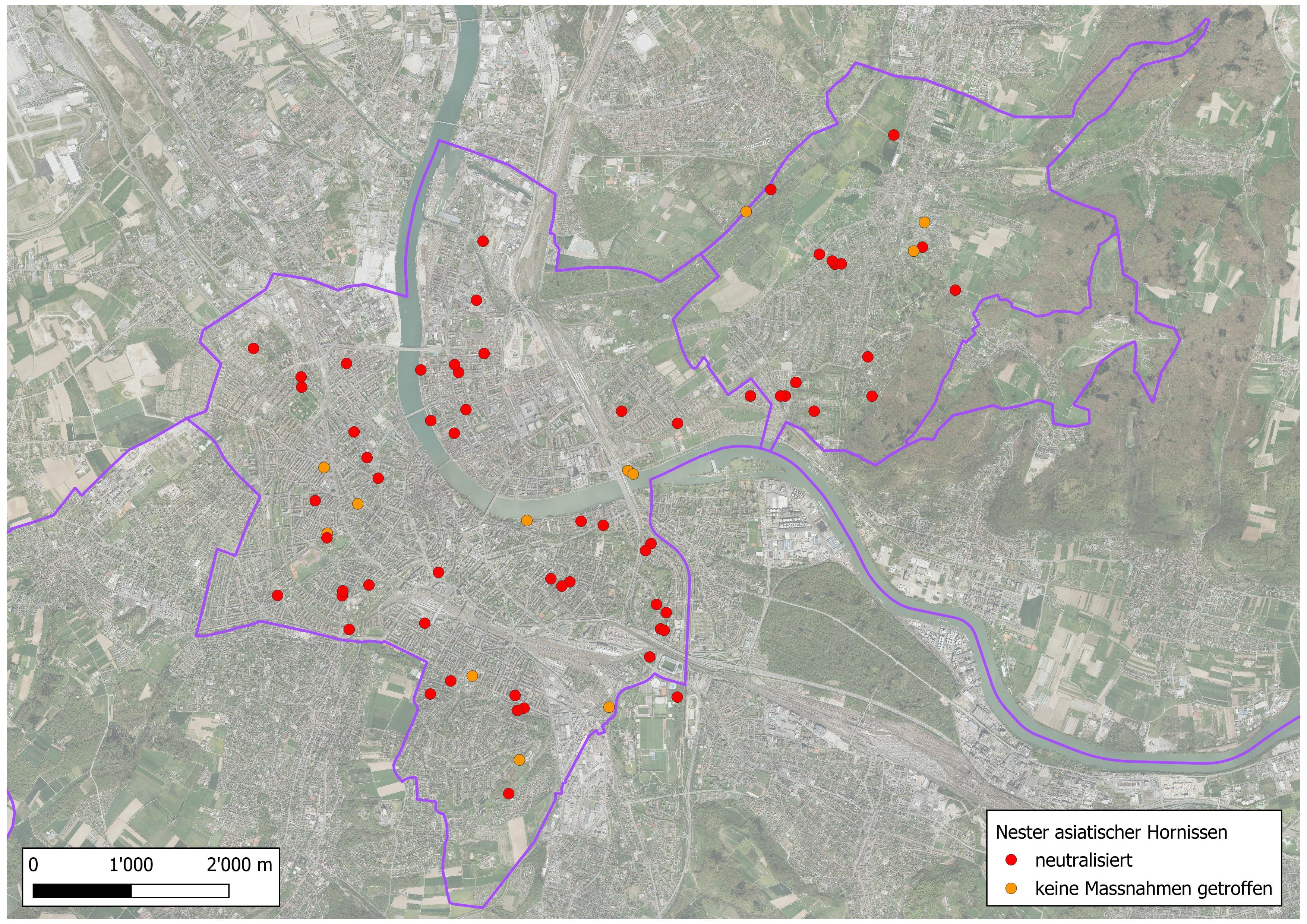 In bebauten Gebieten ist die Nestsuche mit technischen Mitteln oft nicht möglich. Auch 2025 konnten die meisten Nester im Kanton Basel-Stadt aufgrund einer direkten Sichtung und Meldung von der Bevölkerung gefunden und anschliessend von Fachpersonen entfernt oder neutralisiert werden. Diese Erkenntnis zeigt, dass für die Eindämmung der asiatischen Hornisse weiterhin das wertvolle Engagement der Bevölkerung und der Imkerinnen und Imker erforderlich ist. Dafür bedankt sich das Kantonale Laboratorium auch an dieser Stelle sehr. Vor allem verdächtige Nester sollen fotografiert oder gefilmt und über die Schweizer Meldeplattform www.asiatischehornisse.ch gemeldet werden.
