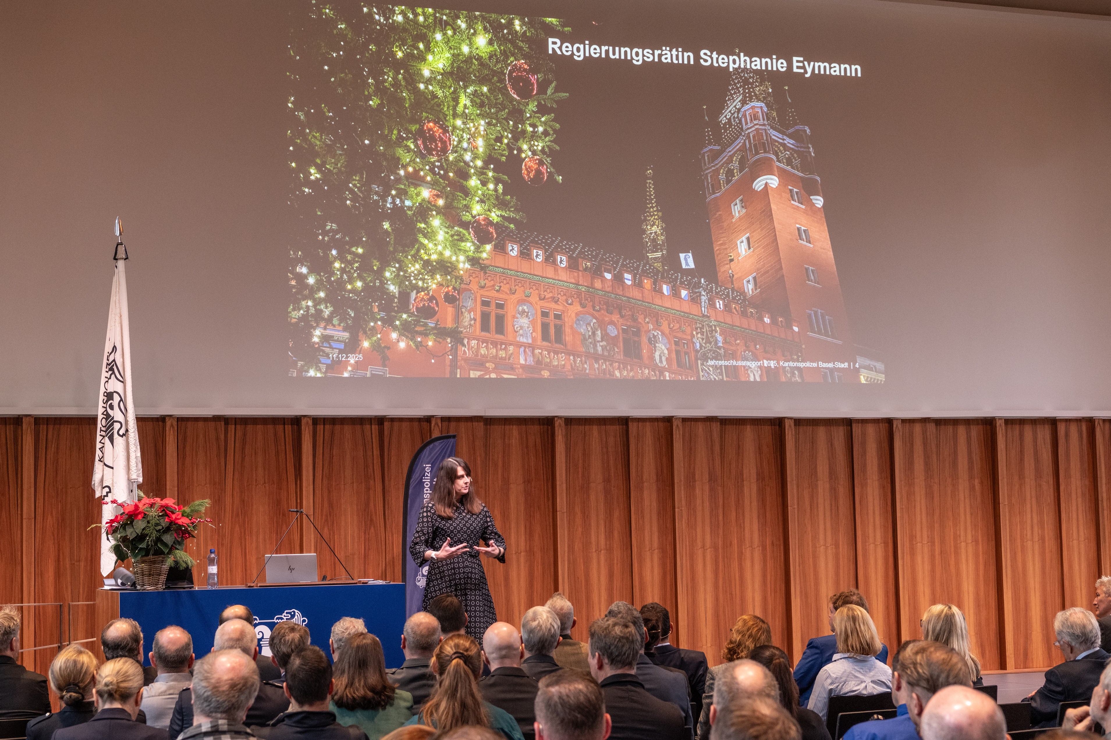 Der zweite Jahresschlussrapport der Kantonspolizei fand am Donnerstag, 11. Dezember 2025 in der Aula des Kollegiengebäudes der Universität Basel statt. Regierungsrätin Stephanie Eymann bezeichnete die Kantonspolizei in ihrer Ansprache vor mehr als 150 Anwesenden aus Polizei, Politik und Verwaltung als Puzzle: Als ein Gefüge, das im Jahr nach dem Schefer-Bericht wieder sorgfältig zusammengesetzt wird. Sie würdigte die Leistung des Korps, das in dieser Phase des grossen Wandels professionell, zuverlässig und loyal seinen Auftrag erfüllt hat.