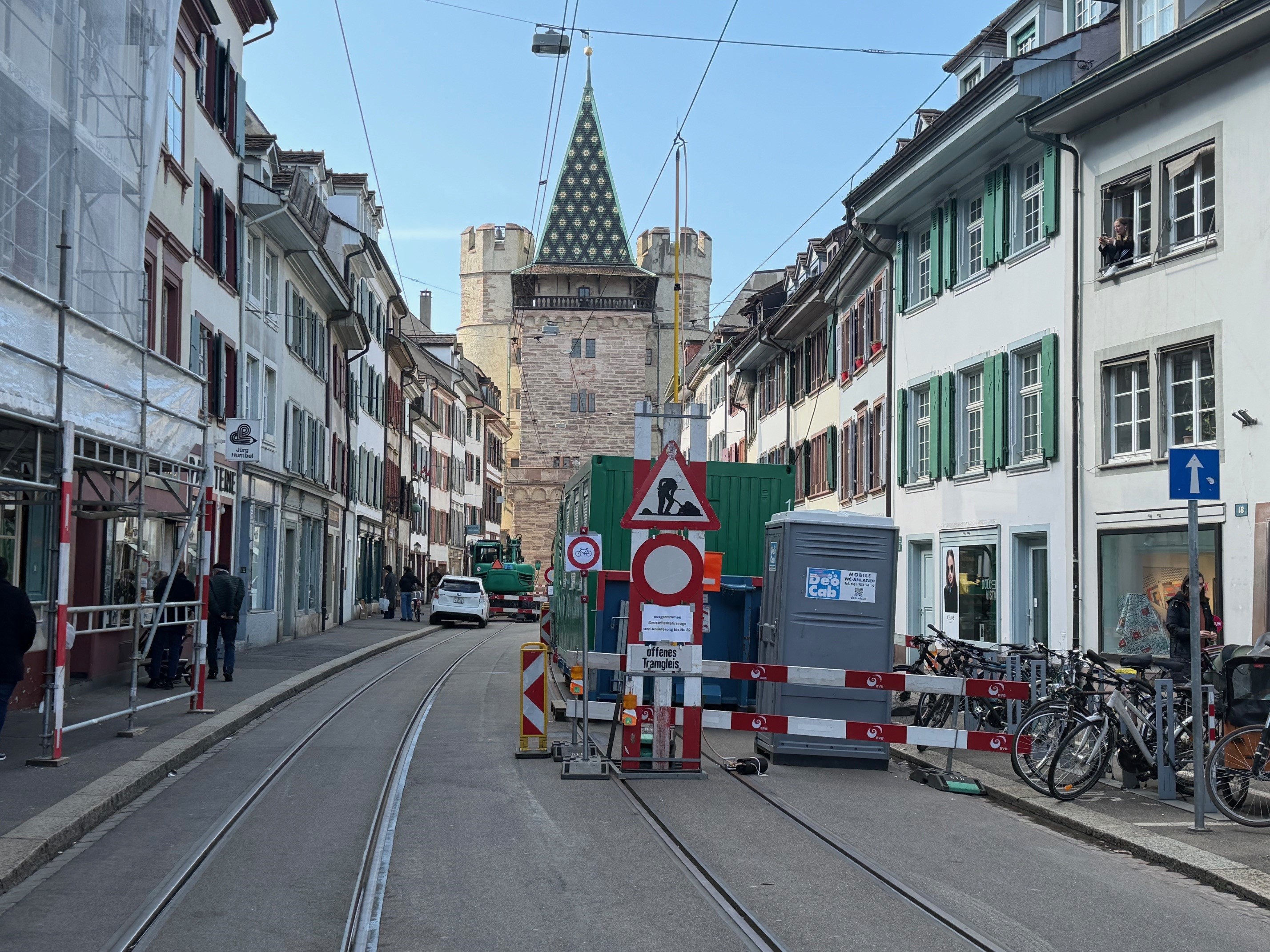 Aufgrund von Gleiserneuerungsarbeiten ist die Durchfahrt durch die Spalenvorstadt derzeit nicht möglich. Eine entsprechende Umleitung ist signalisiert. Beobachtungen der Polizei und Beschwerden aus der Bevölkerung haben jedoch gezeigt, dass viele Velofahrende den kleinen Umweg nicht fahren, sondern stattdessen die Trottoirs in der Spalenvorstadt befahren. Dies kann aufgrund der engen Platzverhältnisse zu gefährlichen Situationen führen.