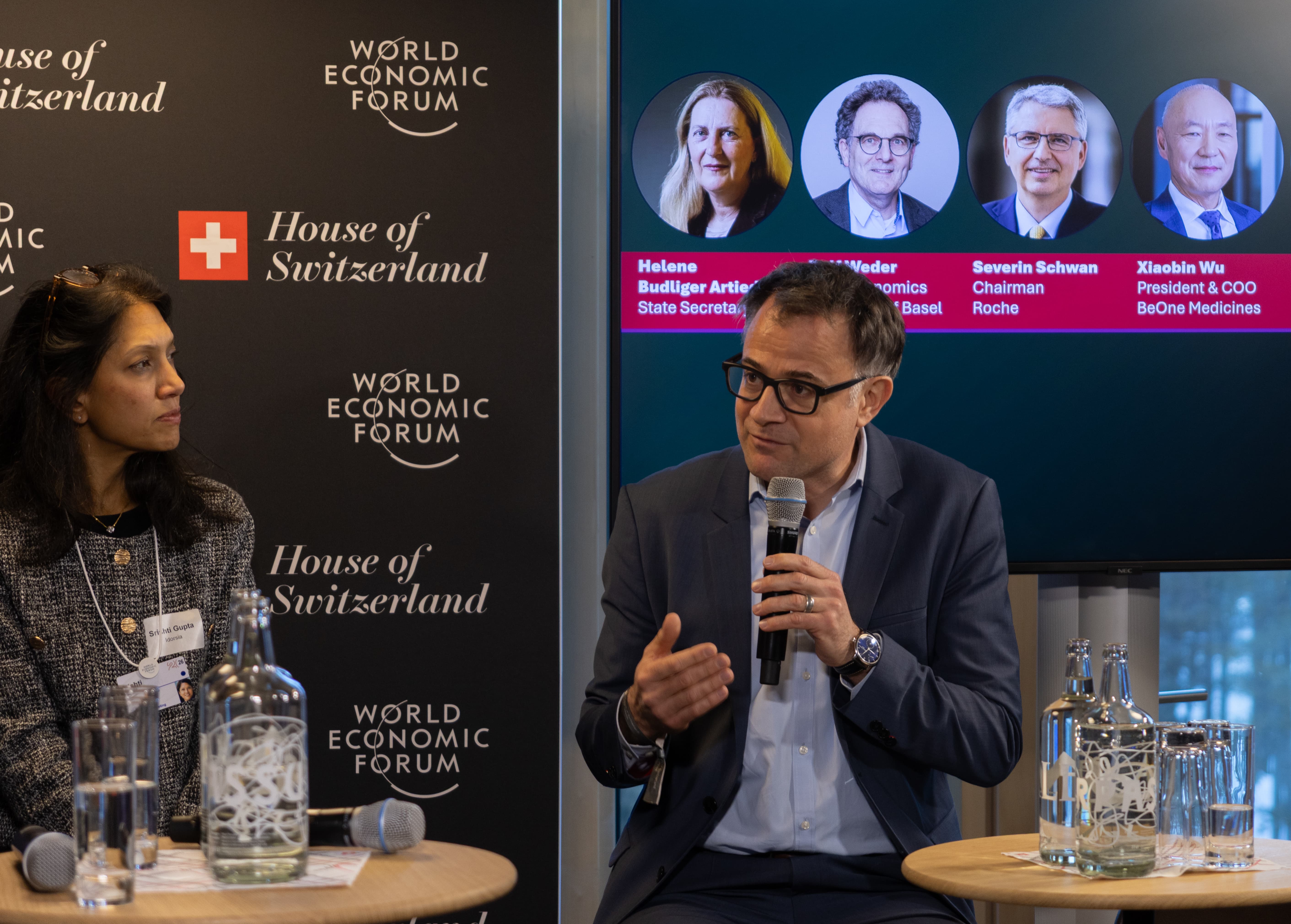 Am Podium nahmen Dr. Severin Schwan, Verwaltungsratspräsident, Roche Holding, Dr. Xiaobin Wu, Präsident und COO, BeOne Medicines, Dr. Srishti Gupta, CEO Idorsia, Prof. Dr. Rolf Weder, Professor für International Economics, Universität Basel, Helene Budliger Artieda, Staatssekretärin SECO und Kaspar Sutter, Regierungsrat Kanton Basel-Stadt, Vorsteher Departement für Wirtschaft, Soziales und Umwelt, teil.