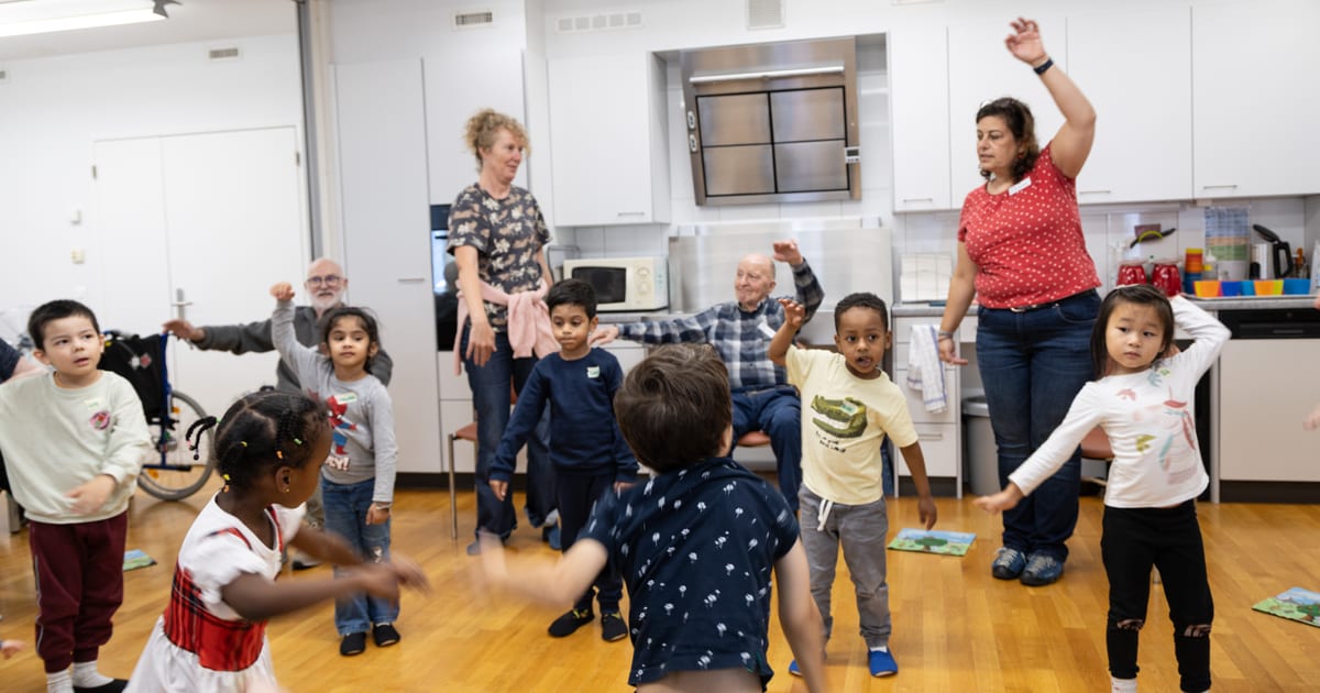 Kinder und Senioren bewegen sich zusammen in einem Raum.