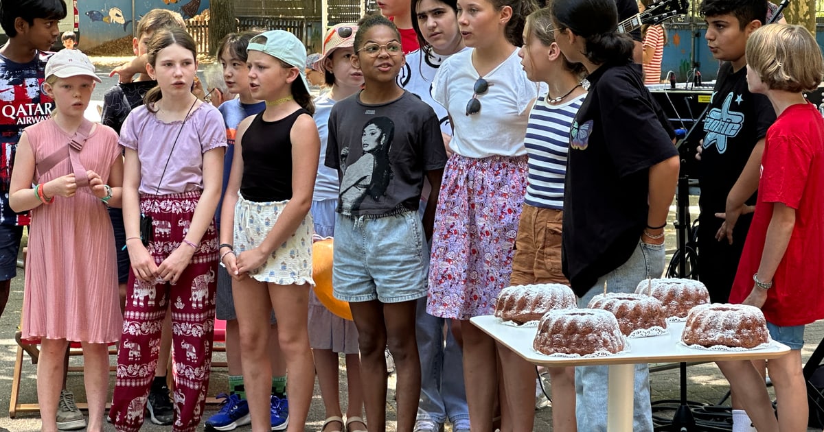 Kinderchor am Iseli-Markt mit Kuchen auf einem Tisch.