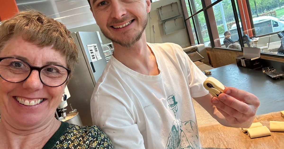 Zwei Personen in einer Bäckerei lächeln mit Teigstücken in der Hand.