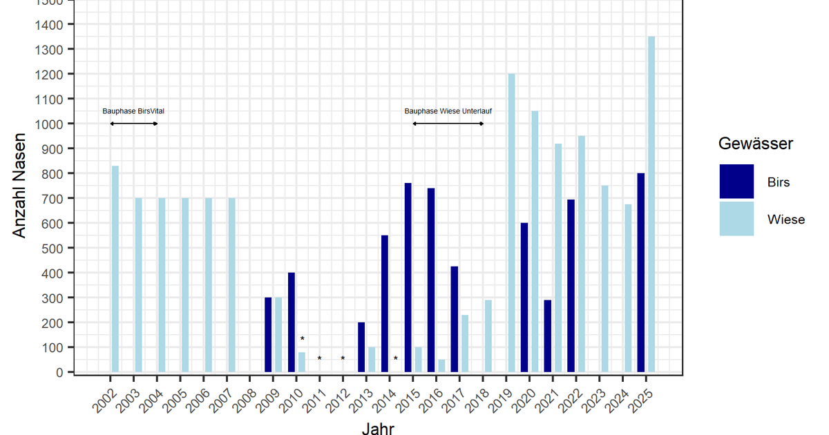 Die zum Laichen versammelten Nasen werden regelmässig gezählt respektive geschätzt. Je nach Wasserstand und Trübung sind die Fische unterschiedlich gut zu erkennen. Erfreulicherweise hat sich der Bestand der Laichtiere in Wiese und Birs in den letzten Jahren stabilisiert und sogar leicht zugenommen (siehe Abbildung). Im Jahr 2025 wurden in der Birs 800 und in der Wiese 1350 Tiere verzeichnet. Grund für diese positive Entwicklung sind Massnahmen zur Gewässerrevitalisierung wie beispielsweise die Entfernung von Wanderhindernissen, Kiesschüttungen zur Bildung von Laichhabitaten sowie die Schaffung von Flachwasserzonen und Unterständen für Jungfische.