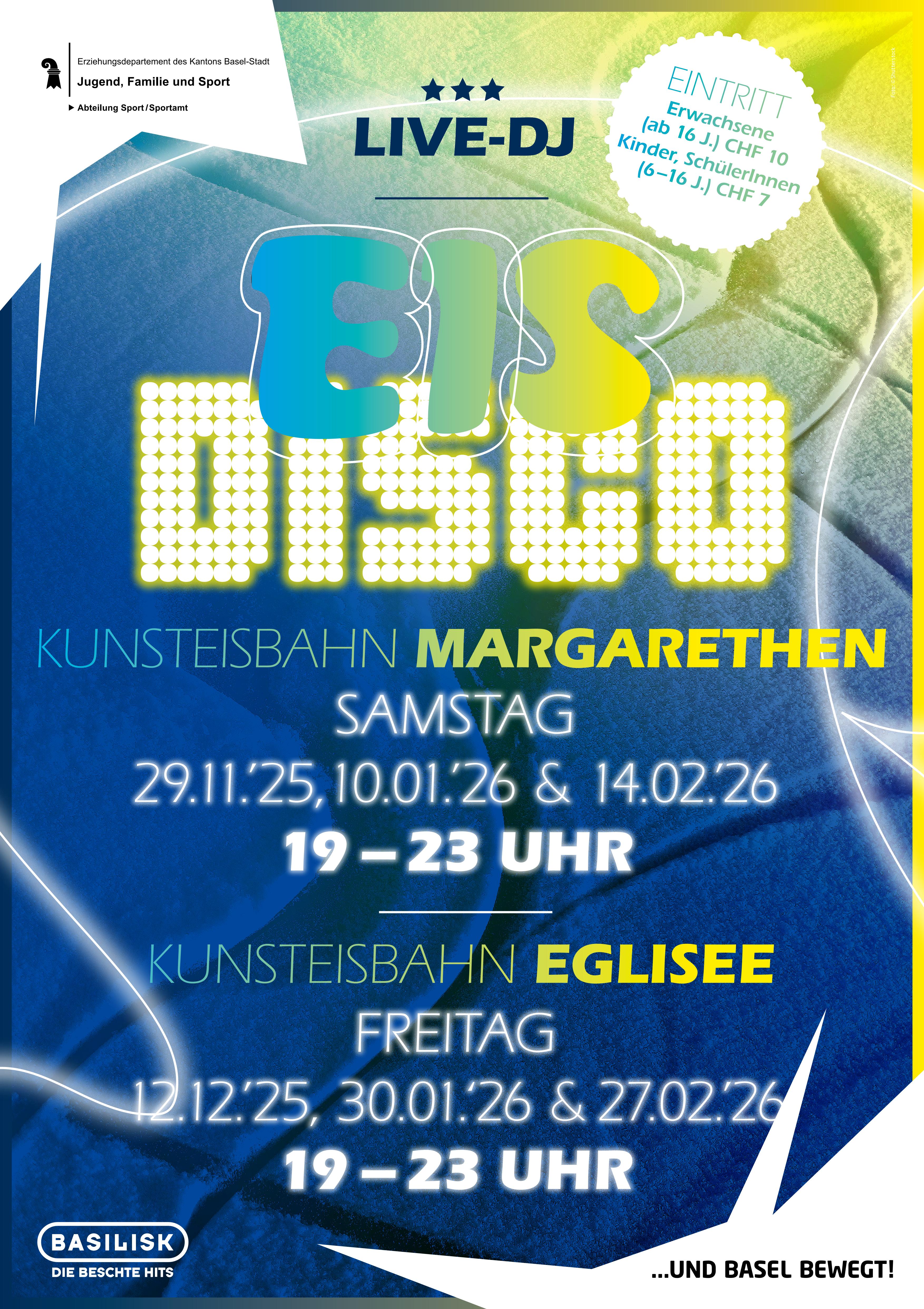 Nebelmaschine, Lichteffekte und ein DJ verwandeln die Eisflächen der «Kunschti Margarethen» und der «Kunschti Eglisee» zu einer Eis-Disco! Kleine und grosse Schlittschuhläuferinnen und -läufer erleben die Kunsteisbahnen im farbig-glitzernden Dekor und können ihre Runden drehen, während sie ihr Tanzbein schwingen.